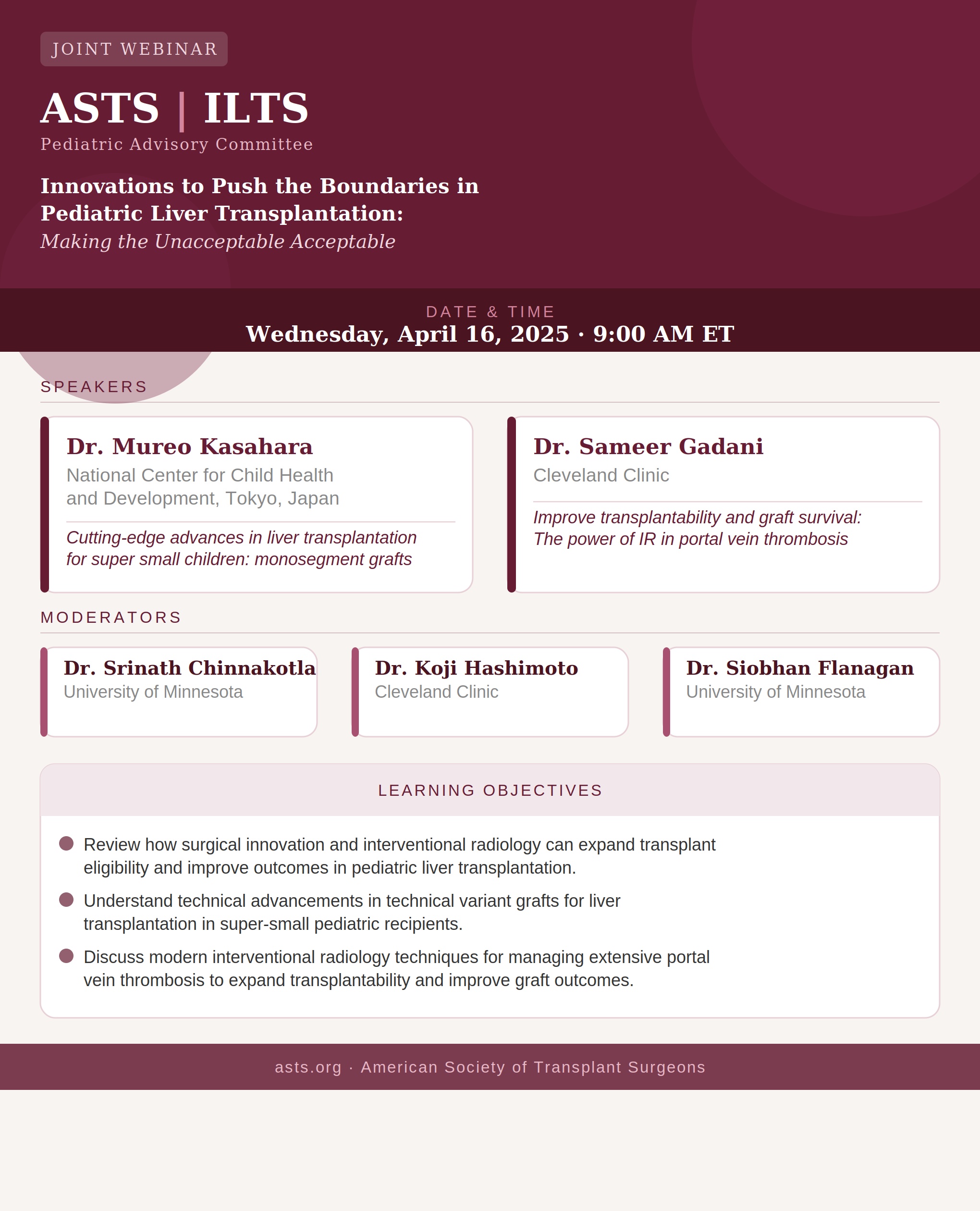 ASTS and ILTS Joint Webinar - Pediatric Advisory Committee: Innovations to Push the Boundaries in Liver Transplantation [April 16, 2026]